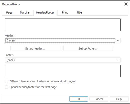 In the comboboxes of the Header/Footer tab select one of the predefined header and/or footer types, or create custom ones.
