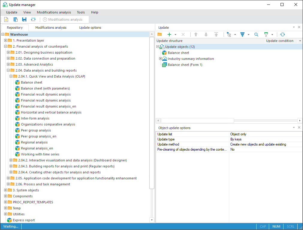To synchronize objects between repositories and their updates, use the Update Manager tool: