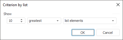 Top N. The operation is used to display the specified number of list elements. The number of elements is specified either directly or in percentage of total amount of filtered elements: