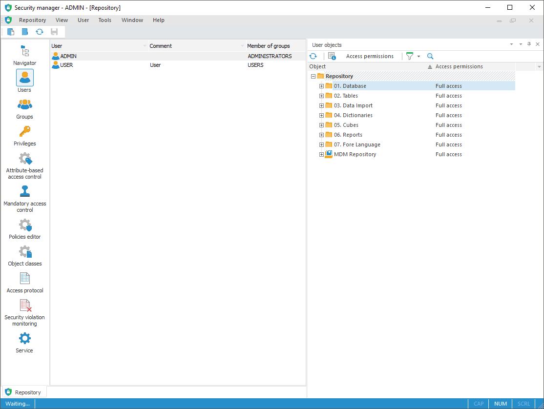 Users are security subjects of the system and have certain permissions to work with repository objects. Permissions can be obtained explicitly (if permissions are determined separately from users) and implicitly (if permissions are inherited from a group of users).