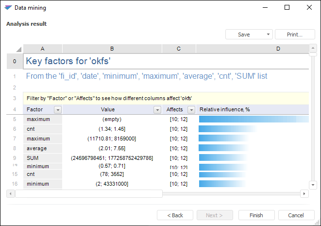 The Analysis Result page look depends on the type of data mining method: