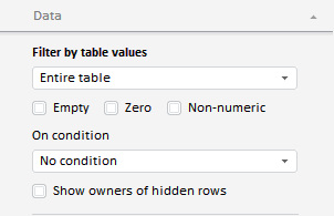 Executing the example requires that the HTML page contains the ExpressBox component named expressBox (see Example of Creating the ExpressBox Component). By default the Filter by Table Values section in the Data tab of express report properties panel looks as follows: