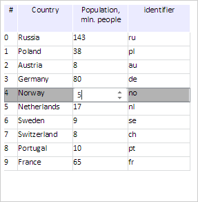 Double click the Country column cell of the row with the 4 index. As a result, editor is activated in the cell: