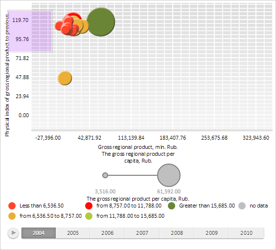 To execute the example, the HTML page must contain the BubbleChart component named bubbleChart (see Example of Creating the BubbleChart Component). Create a new selection frame with other background color and add it to bubble chart. Set a handler for mouse cursor move event for bubble chart selection frame and start rendering of selection frame: