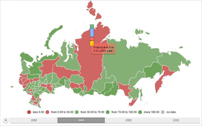 To execute the example the HTML page must contain the MapChart component named map (see Example of Creating the MapChart Component). Create a bar factor for a map layer area with the RU-KYA identifier and show a tooltip for it: