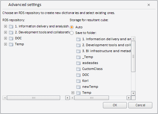The RepositoryDialog class implements the dialog box where the user selects desired MDM repository and the place to store the resulting cube that opens on clicking the More button on the third page of data import wizard.