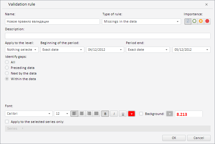 After executing the example the Validation Rule dialog box is shown in the workbook. Type of this rule is Missing Data, missing values are detected within data, exact start date of the period to check is 12.04.2012, exact end date is 12.05.2012: