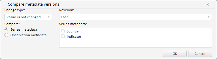 Executing this example requires the ValidationSettingsDialog component named validationSettingsDialog (see Example of creating the ValidationSettingsDialog component). Show the data validation wizard that compares versions of time series metadata: