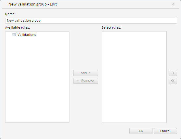 The ValidationGroupSettingsDialog component is a dialog box for editing a group of validation rules in the workbook.