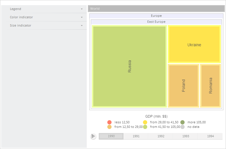To execute the example the HTML page must contain the TreeMap component named treeMap and the component TreeMapMaster named «treeMapMaster» (see «Example of the TreeMapMaster and TreeMap Component Layout» ). Process the PropertyChanged event, set a new object that represents a data source of the wizard with changed opacity value, show IDs of color, legend and size panels: