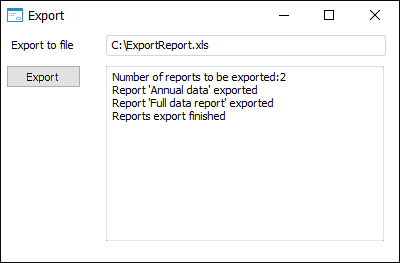 This form should work as follows: a user clicks the Export button, which calls the dialog box opening repository objects. Only express reports can be selected in this dialog box. If a user selects one or several express reports, the reports are to be exported to the file specified in the EditBox component in XLS format. Default file specified in the EditBox component is C:\ExportReport.xls. Messages on export progress are displayed in the Memo component.