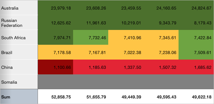 After executing the example conditional formatting is applied to the whole table. The palette containing yellow color and shades of green and red colors is used for cell fill. Database cells are filled with grey color: