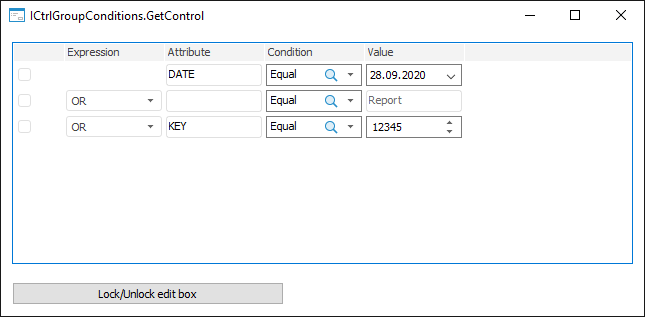 To execute an example, create a form given in the example for the ICtrlGroupConditions.AddRow method. Add the Button component named Button1 on the form and set the Text property to Unlock/Lock Edit Box.