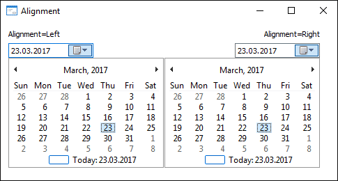 The Alignment property determines the type of alignment of the drop-down calendar relative to the component borders.
