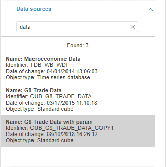 To search for data sources, use the search field in the upper part of the Data Sources tab. The search field is displayed on selecting visualizer data source, and its appearance is different depending on the search mode: