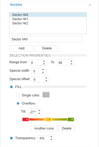 Transparency. Parameters of sector transparency. The checkbox is selected by default, and sector transparency can be adjusted: 100% corresponds to transparency (the sector becomes invisible), 0% corresponds to opacity.