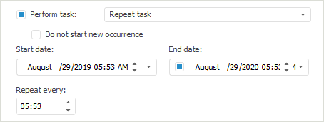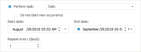 End Date. Selecting this checkbox enables the user to set time and date of the last task execution, when they are reached, the task will be no more executed. By default the setting is deactivated.