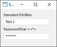 | PasswordChar | The PasswordChar property determines the character, which replaces the actual characters entered by the user. | |