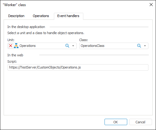 To set an operation handler in the web application, specify script URL in the Script box (JS file or HTML page containing the script) that implements operations, for example, https://TestServer/CustomObjects/Index.html or https://TestServer/CustomObjects/Operations.js.
