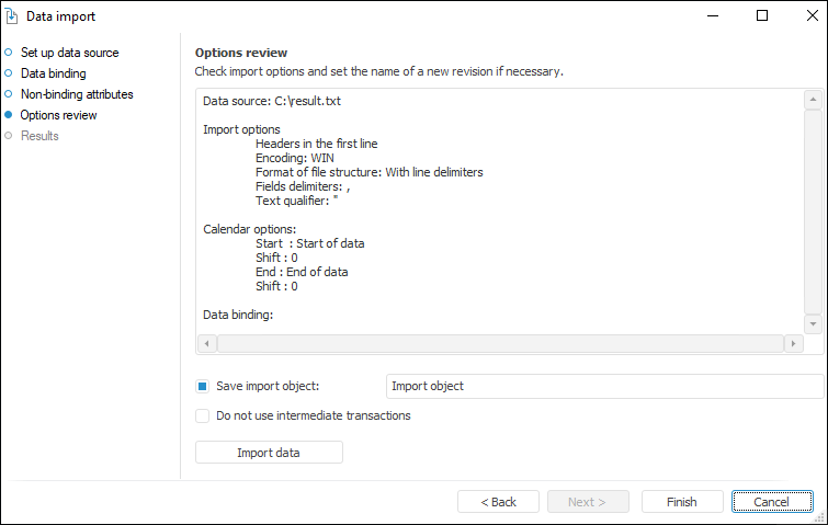 To import as part of one transaction, select the Do Not Use Intermediate Transactions checkbox. It will help to avoid the situation when user get incomplete data retrieved from time series database during import. It is recommended to use if several users are working with time series database at the same time.