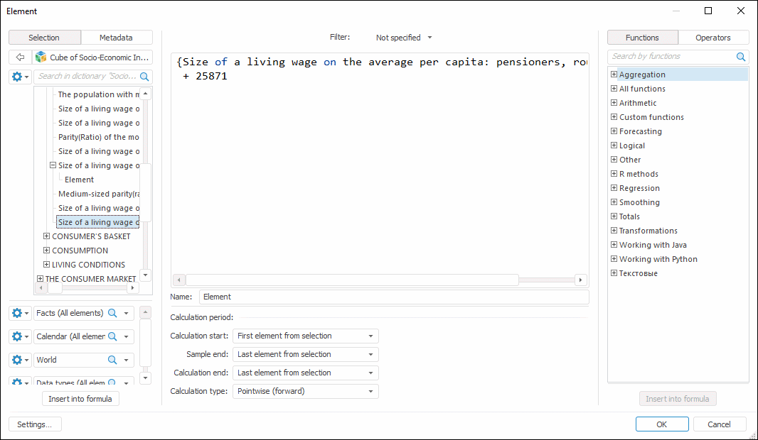 After clicking the Button2 button a dialog box of expression editor for regular report calculated element opens, which contains the element formula that can be edited: