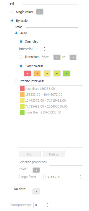 By Scale. Arrow fill is calculated by the color scale. The scale specifies the set of number intervals and the fill method for each interval. All parameters for setting up arrow fill by color scale match the map territory fill parameters by color scale.