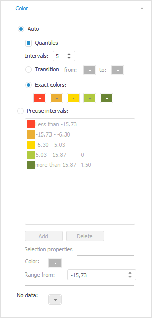 Map fill is calculated by the color scale. The scale specifies the set of number intervals and the fill method for each interval.