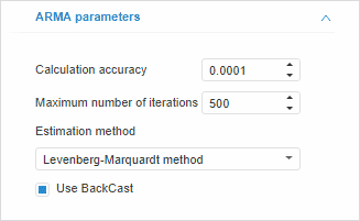To set up parameters of autoregression or moving average (ARMA) coefficients estimation, use the Parameters of ARMA Estimation side panel tab. The tab is displayed if the ARMA order is specified for the method.