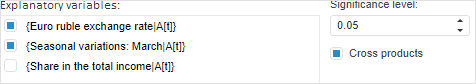 Cross Products. Selecting the checkbox enables the use of both the existing explanatory series and their cross products. For example, the S1 and the S2 series are considered. Using the cross products, the following regressors are considered: S1*S1, S1*S2, S2*S2. It is not recommended to include cross products if the number of explanatory variables (regressors) is large.