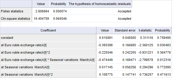 The following is given for each statistics: value, statistics probability and the test result (whether the hypothesis on homoscedasticity of residuals is accepted or rejected).