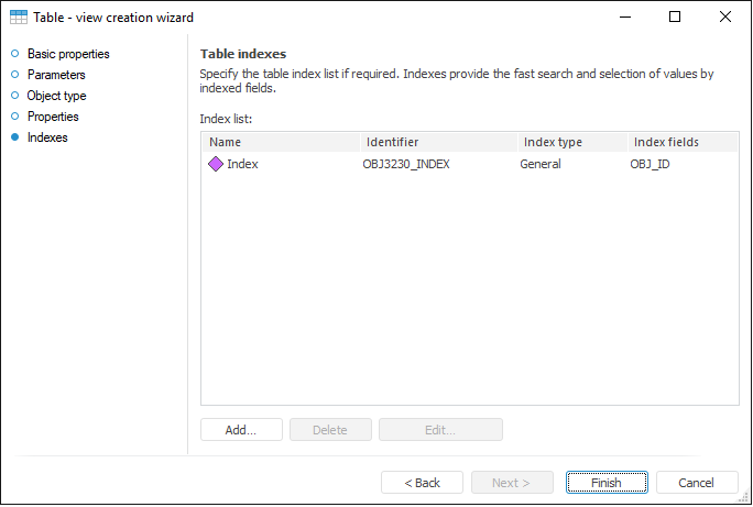 The Table Indexes page enables the creation of a table index list. Indexing provides quick search and selection of values based on indexed fields.