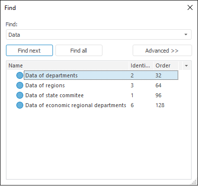 Find Next. The first found element gets focus. Clicking this button again moves the focus to the next found element and so on. An information message is displayed when the dictionary reaches the end.