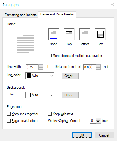To add frames around text and set up page numbering, use the Frame and Page Breaks tab: