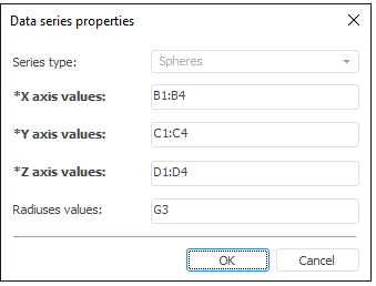 The Data Series Properties dialog box opens on adding or editing 3D scene data sources. Dialog box appearance depends on the selected series type.