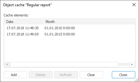 To cache reports, select the Object Cache item in the regular report context menu in the object navigator. The Object Cache dialog box opens.