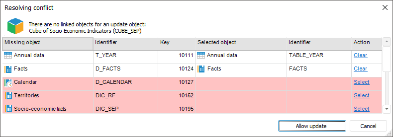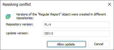 Corresponding object is controlled by VCS. The conflict occurs if the update contains objects added to version control system. To resolve the conflict, click the hyperlink in the Conflict box and confirm the update: