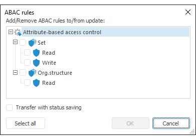 To save attribute-based access control statuses in the update, select the Transfer with Status Saving checkbox. The status determines whether it is allowed to check access permission by existing element and it is set up by checkboxes next to the attribute access structure elements in the security manager. On updating attribute access structure, statuses of structure elements will be refreshed. The rules statuses will be transferred with corresponding policy.