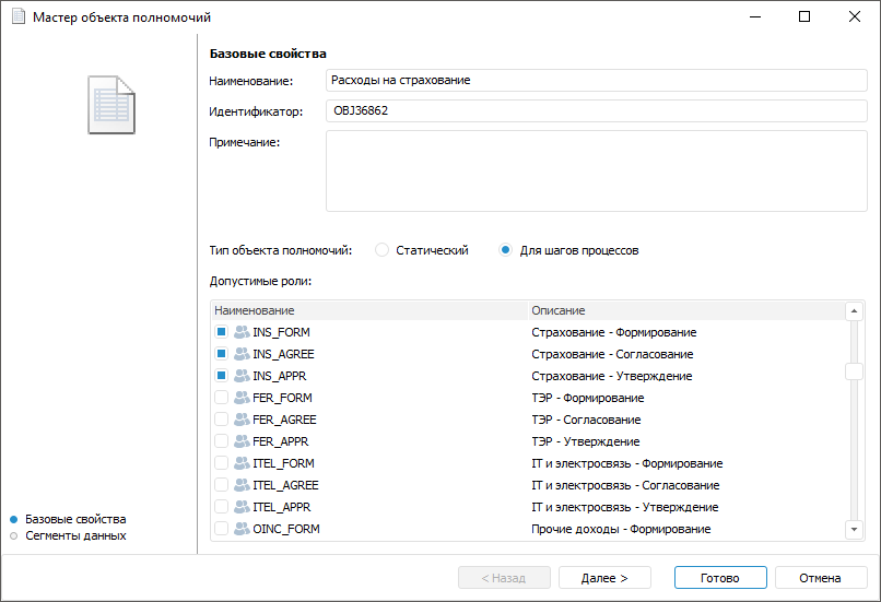 После определения базовых свойств объекта полномочий нажмите кнопку «Далее».