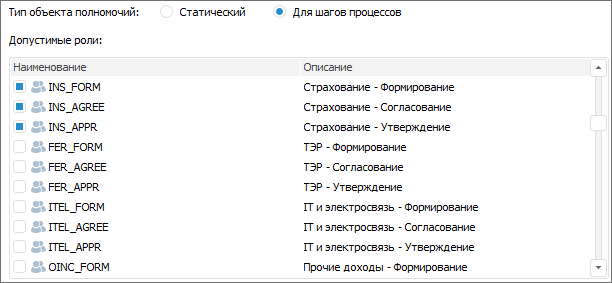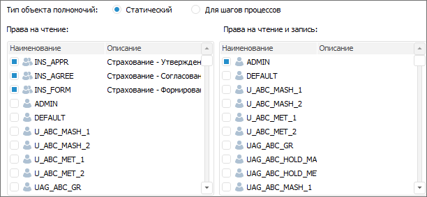 Примечание. Объект полномочий с динамическими правами доступа должен быть указан при создании шагов процесса.