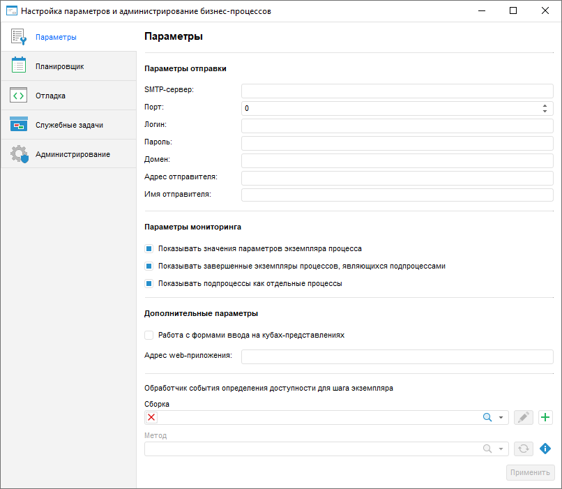 Настройка параметров процесса | Настройка параметров бизнес-процессов | Настройка планировщика бизнес-процессов | Настройка отладки бизнес-процессов | Создание служебных задач для бизнес-процессов | Администрирование бизнес-процессов