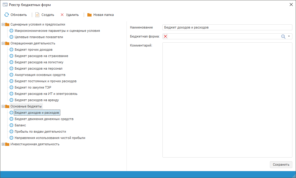 Список бюджетных форм. Содержит список бюджетных форм, используемых в настройке сценариев планирования;