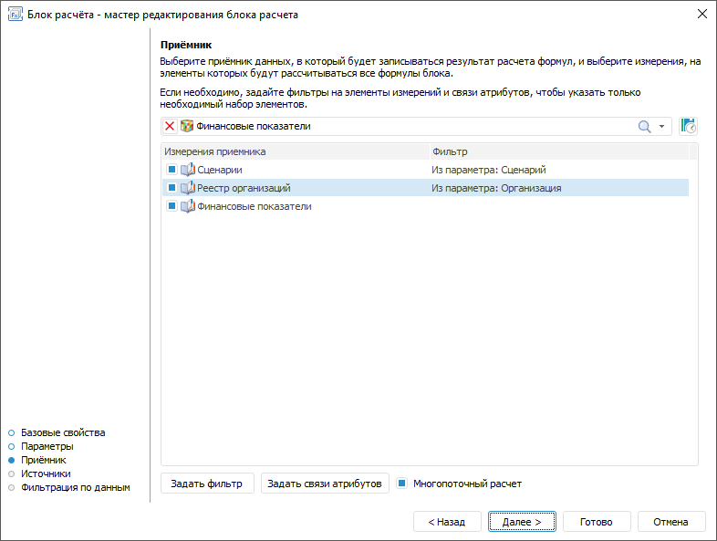 Выбор и настройка приёмника данных выполняется на странице «Приёмник» в мастере редактирования блока расчёта: