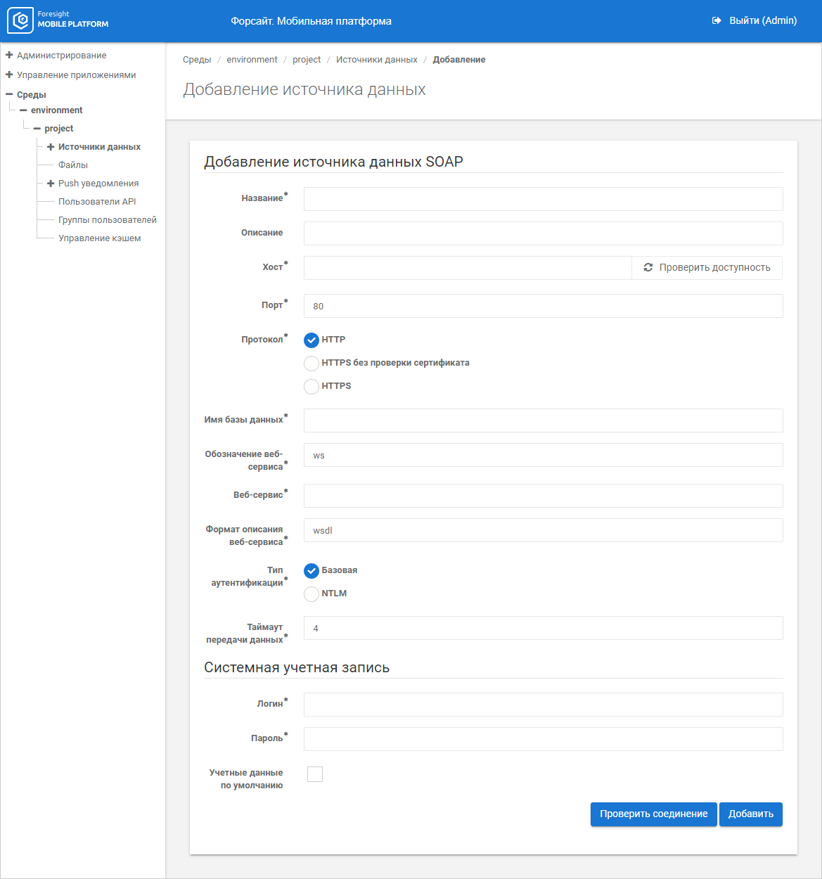 Примечание. Для источников данных JSON, WEB, Foresight Web автоматически добавляются анонимные учетные данные по умолчанию на вкладке «Учётные данные» после настройки подключения. Для источника данных Exchange добавление учетных данных доступно только после настройки подключения.