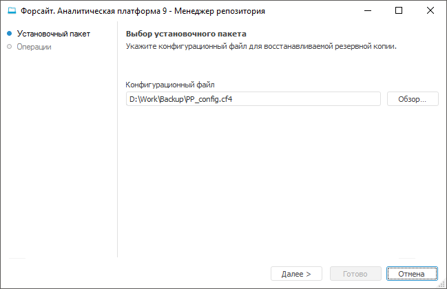 Укажите путь к конфигурационному файлу, который был использован для создания резервной копии. Процедура восстановления репозитория использует резервные копии, созданные при резервном копировании. Копии располагаются в той же папке, в которой находится конфигурационный файл.