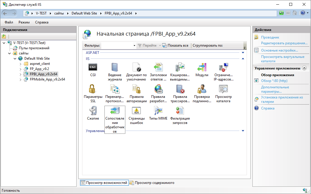 В дереве «Подключения» выберите виртуальный каталог «fpBI_App_v9.2 x64» и дважды кликните «Сопоставления обработчиков»: