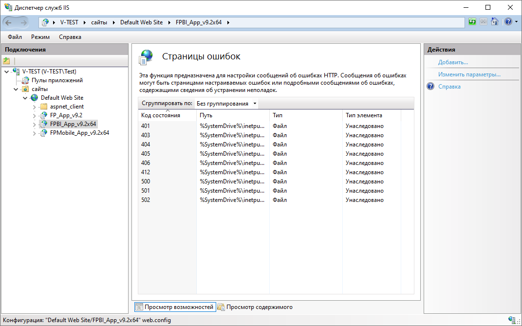 На панели «Действия» выберите «Изменить параметры». Будет открыто окно «Изменение параметров страниц ошибок»: