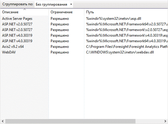 Для строк «ASP.NET v4.0.30319» и «Axis2 v9.2 x64» в столбце «Ограничение» должно отображаться «Разрешено»: