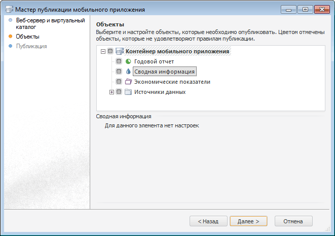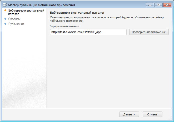 Будет открыт мастер публикации мобильного приложения, содержащий следующие страницы: