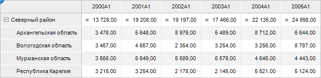 Настроим права доступа в источнике данных: установим ограничения на изменение данных для Архангельской и Мурманской областей. Так как в таблице одновременно располагаются ячейки, на которые у пользователя нет прав, а также ячейки вычисляемых элементов, то в таблице будут отображены сразу все пиктограммы: