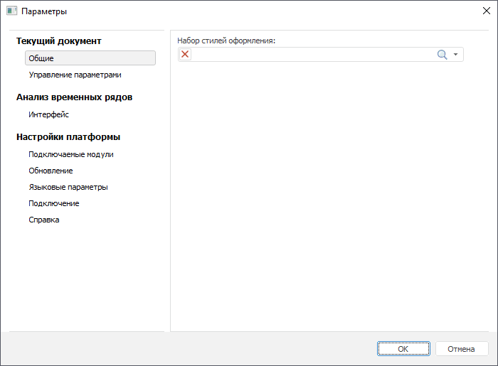 Для настройки параметров инструмента «Анализ временных рядов» в целом и общих параметров продукта «Форсайт. Аналитическая платформа» используйте диалоговое окно «Параметры».